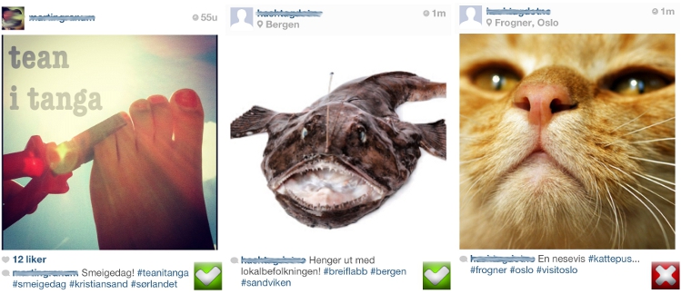 Mange bruker konsekvent hashtag for plassen der et bilde er tatt, uansett innhold i bildet. Er bildet tatt i f.eks Lillesand, så tagger de det med #Lillesand, selv det ikke er mulig å se at bildet er tatt i Lillesand, eller har noen referanser til sørlandsbyen. Det er bare en ting å si om dette; ikkje bra! Hvis bildet ikke viser en referanse til plassen man bruker i hashtagen, har det ingen offentlig interesse for de som sjekker denne hashtagen! Da bør man heller skrive i bildeteksten hvor bildet er tatt, og ikke som hashtag. Har derimot bildet en referanse til plassen man bruker i hashtagen, eller viser et glimt fra en offentlig plass på dette stedet, er det "good to go". Da er det bare å kjøre på med hashtag #ByEllerSted. Noen eksempler...![]() Bilde 1 og 2 er OK å tagge med henholdsvis #kristiansand og #bergen. Dette fordi bilde 1 har en referanse til Kristiansand ved at det spiller på kristiansanderes favorittaktivitet; å sitte med "tean i tanga" (et kjent uttrykk knyttet til plassen). Bilde 2 er også godkjent å tagge med #bergen, fordi det viser en storkjeftet bergenser (myten sier de er breiflabber! Noen som bekrefte/avkrefte?) Bilde 3 derimot, er ikke greit å tagge med #Oslo, da det ikke har noen referanse til hovedstaden. Dermed har det ikke noe verdi for brukere som sjekker hashtag #oslo. Det er greit å "geotagge" bilder uansett innhold (innstilling i flere sosiale medier som viser hvor bildet er tatt (eksempel bilde 2 og 3, øverst under brukernavn)). |